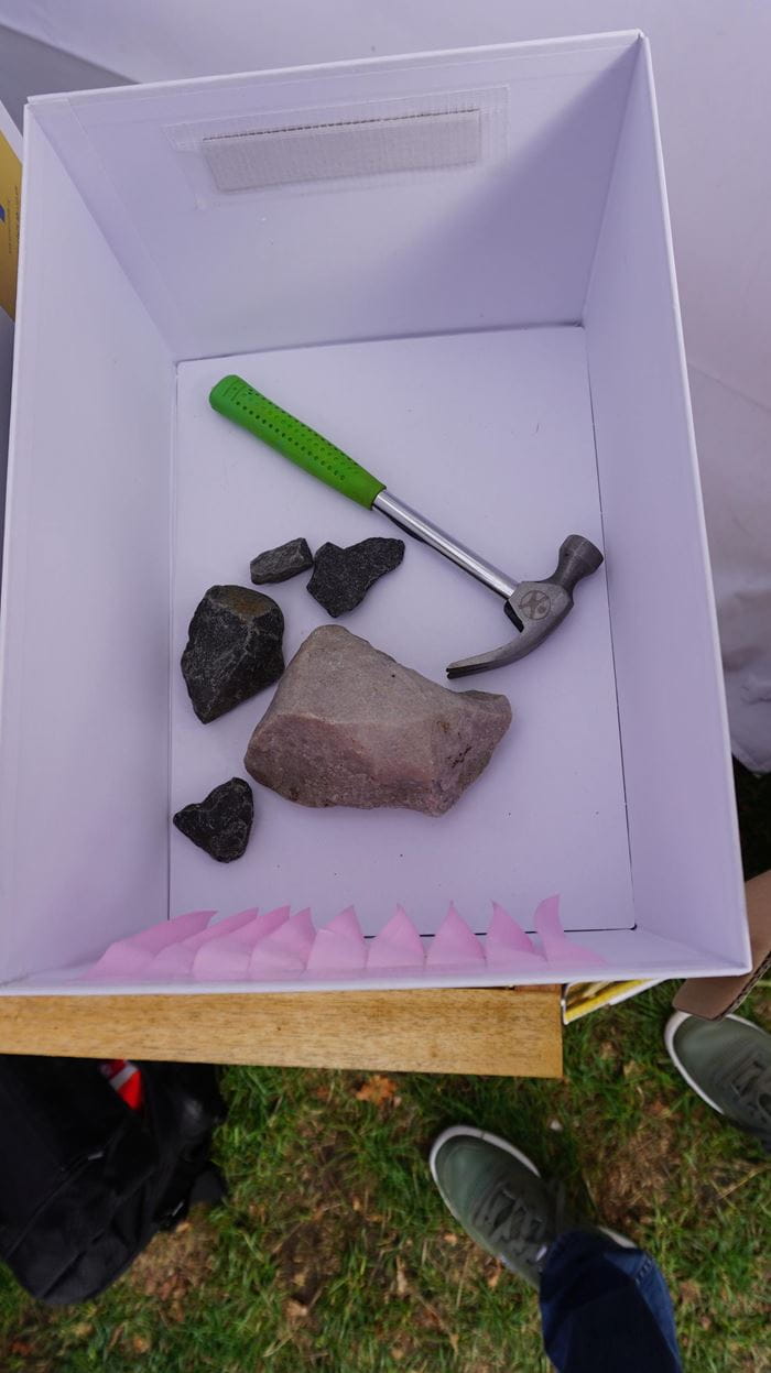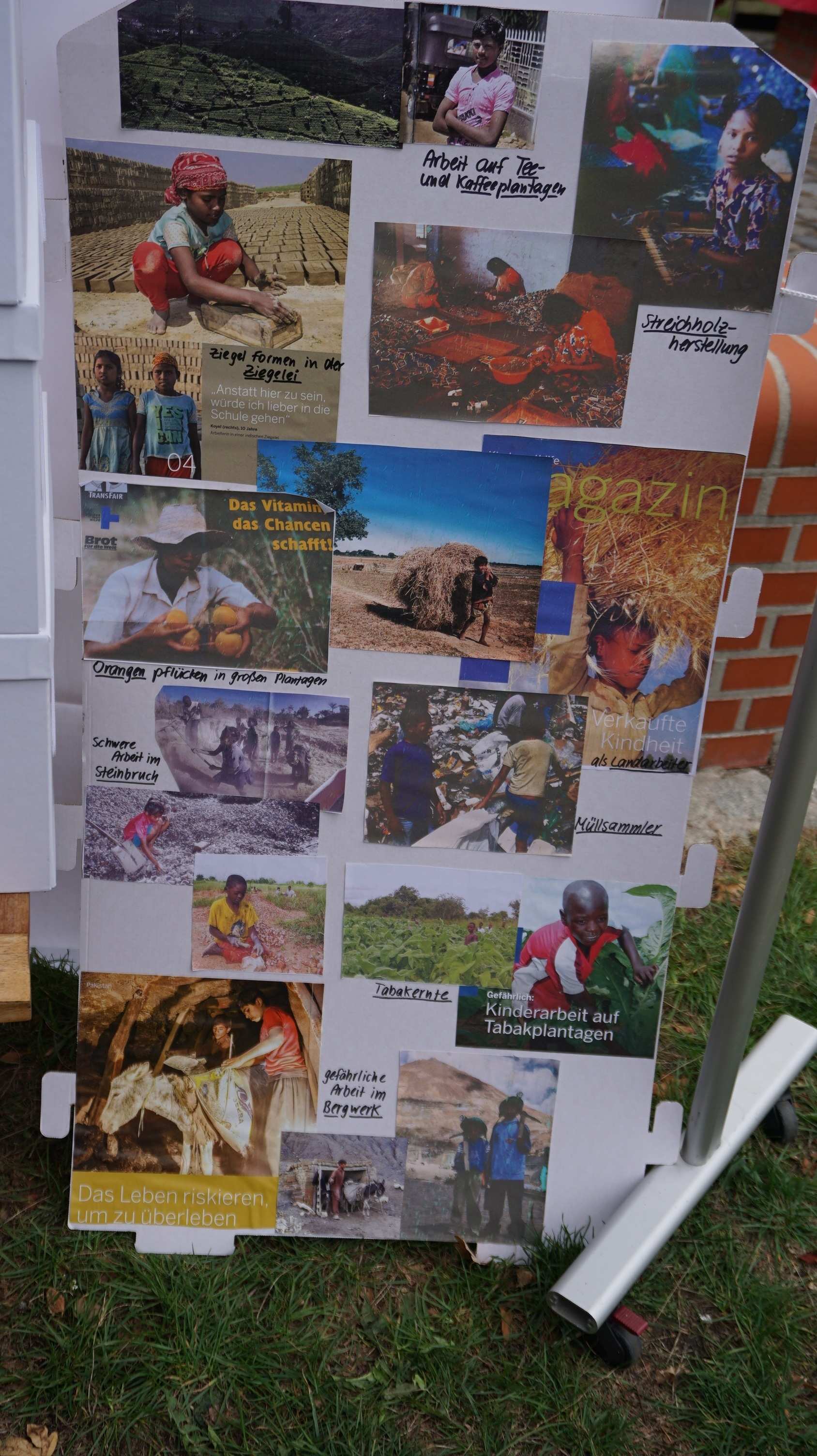 "Huch, da ist ja ein Hammer drin!“ Ein Jugendlicher fingert mit einer Hand in einem der aufeinandergetürmten Kartons herum. Daneben steht eine Fotowand mit der Überschrift „Was weißt du über Kinderarbeit?“ Wieder so eine Idee von Gabriele Molsen. Sie hat vorne eine Öffnung in die Kartons geschnitten und sie von innen mit breiten Stoffbändern zugehängt. Besucher werden aufgefordert, hineinzufassen.
