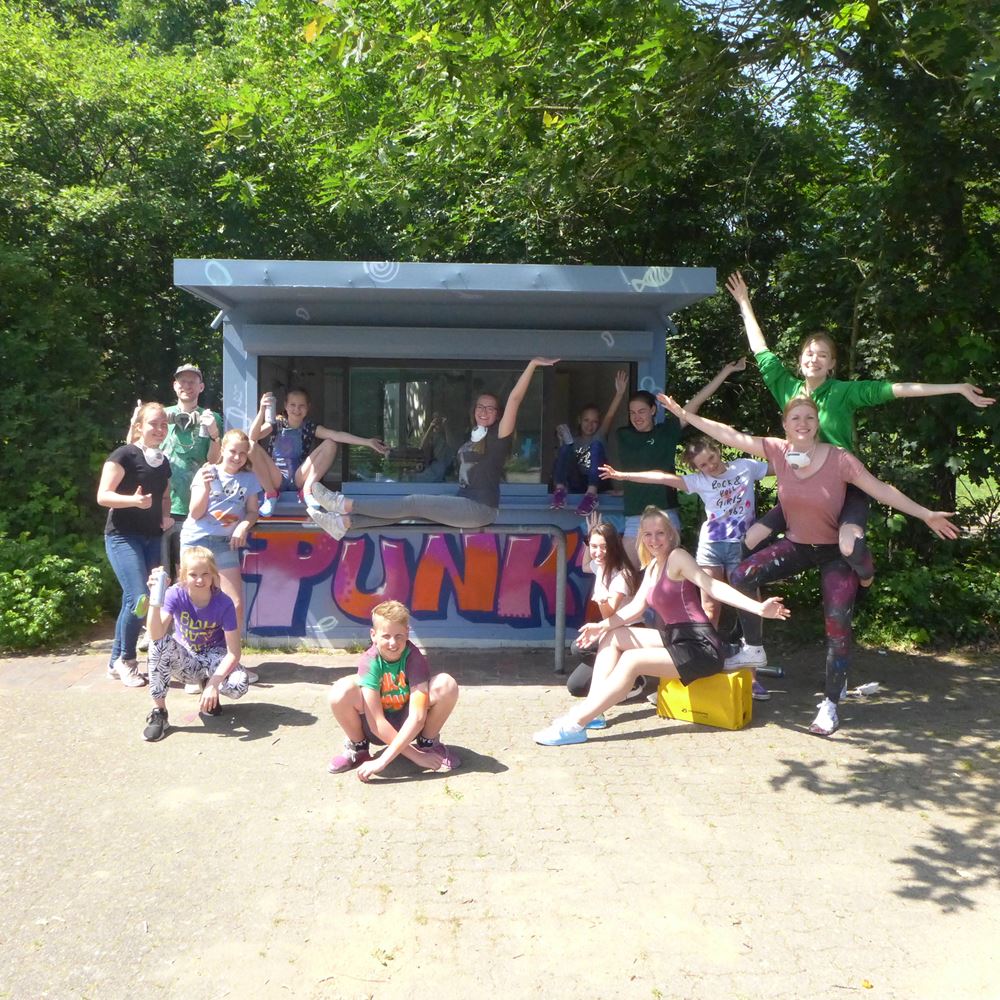 Zum Glück steht auf dem Schulhof der kleine Kiosk „Punkt“ und der wird seit Jahren nicht mehr richtig genutzt. Was für eine Chance! Zusammen mit dem Graffitikünstler Aleks van Sputto wurde der Kiosk mit Graffiti verschönert, nach den Sommerferien startet der Verkauf: An zwei Tagen in der Woche werden hier selbstgebackene Kuchen, Waffeln, faire Schokolade und vieles mehr verkauft. Um den Graffitispruch komplett zu lesen, muss man um den ganzen Kiosk laufen: „Wenn viele kleine Schüler*innen an vielen kleinen Schulen viele kleine Dinge tun, verändert sich der PUNKT und die ganze Welt!“