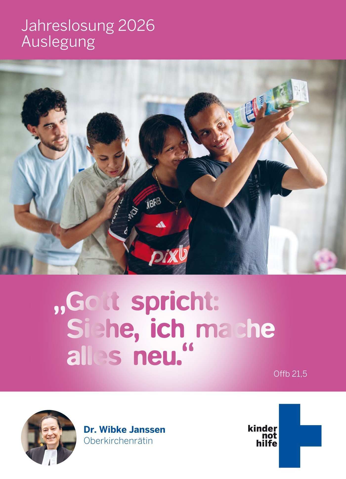 Die Auslegung "Gott spricht: Siehe ich mache alles neu" wurde von der Oberkirchenrätin Dr. Wibke Janssen zur Jahreslosung 2026 geschrieben. In ihrer Auslegung lenkt sie den Blick auf Projekte der Kindernothilfe, die besonders den Schutz vor Gewalt im Fokus haben.
